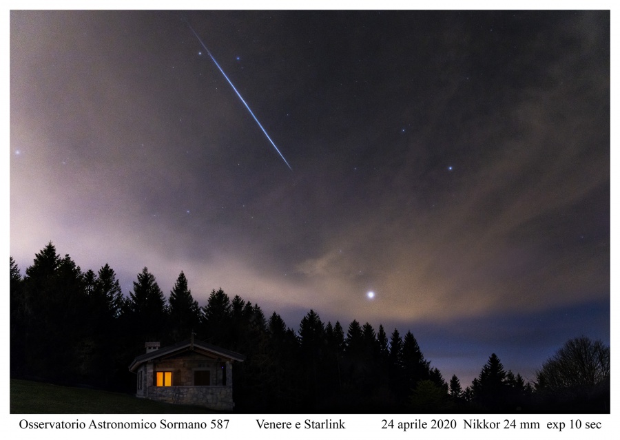 Questo bellissimo scatto, con il pianeta Venere ben visibile appena sopra le cime degli abeti della Colma, cela in realtà qualcosa che preoccupa tutti gli astronomi, professionisti e amatoriali. La scia luminosa che poco più in alto attraversa la costellazione dei Gemelli, tra le brillanti Castore e Polluce, non è una stella cadente: si tratta degli ultimi satelliti lanciati in orbita dall’azienda aerospaziale statunitense SpaceX di Elon Musk.