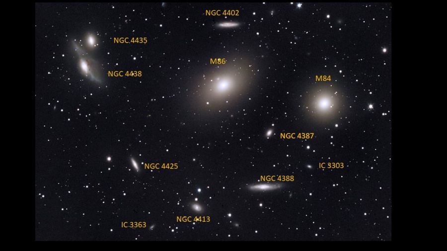 M86 è’ la più’ luminosa, brillando di magnitudo 8.9: si trova a 53 milioni di anni luce e mostra un vistoso spostamento verso il blu, indice di un avvicinamento alla Via Lattea con una velocità’ relativa di almeno 860'000 km/h. Invece con una recessione quadrupla, M84 di magnitudo 9.1, distante 55 milioni di anni luce, ospita al suo centro un buco nero super massiccio da oltre 1.5 miliardi di masse solari.