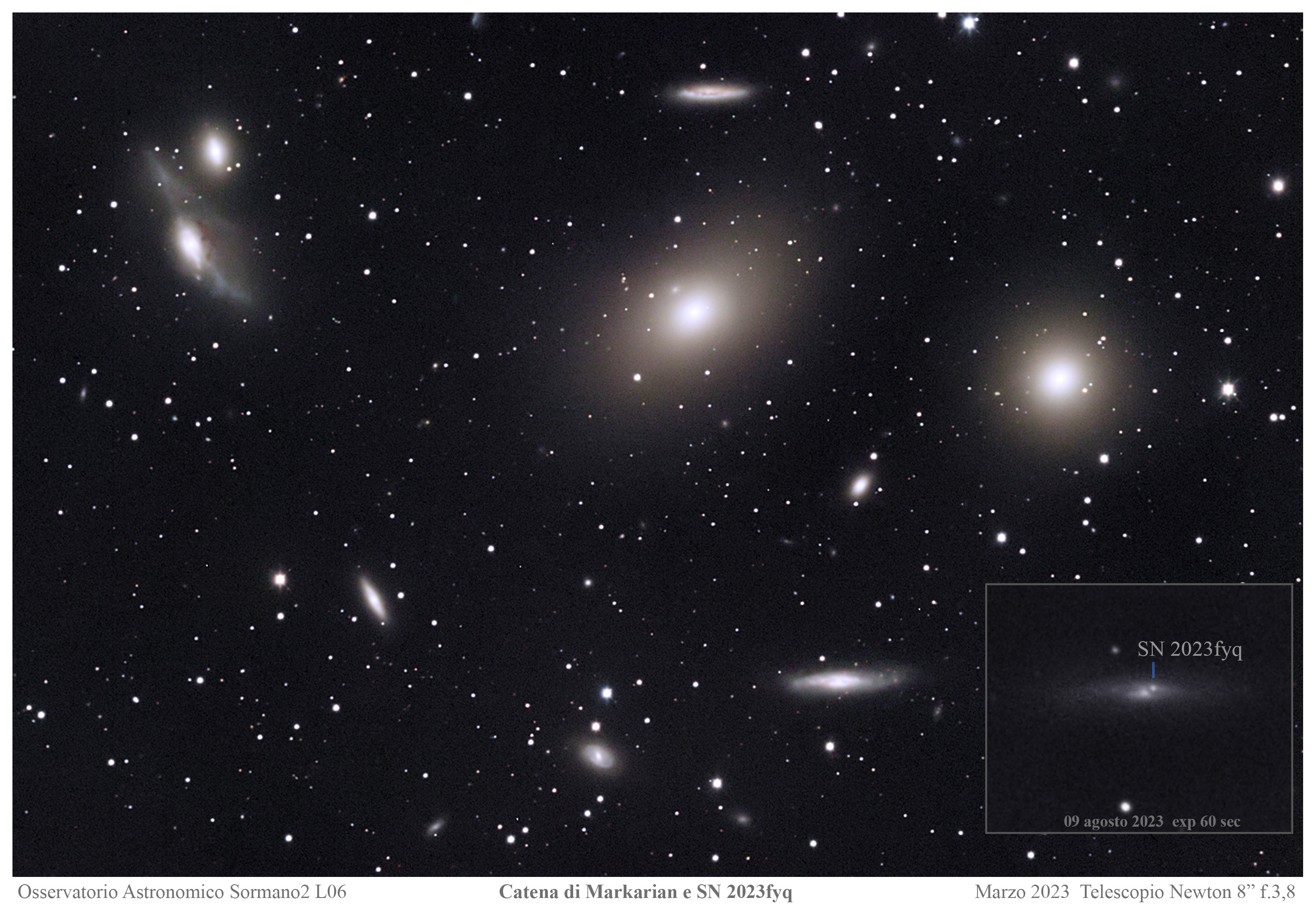 La nostra foto della catena di Markarian è stata ripresa con il newton 8 pollici f/3.8 dell’Osservatorio di Sormano, nel corso del mese di marzo 2023 e, per evidenziare la SN, la sera del 9 agosto 2023 abbiamo effettuato un breve scatto di pochi secondi solo alla galassia ospite.