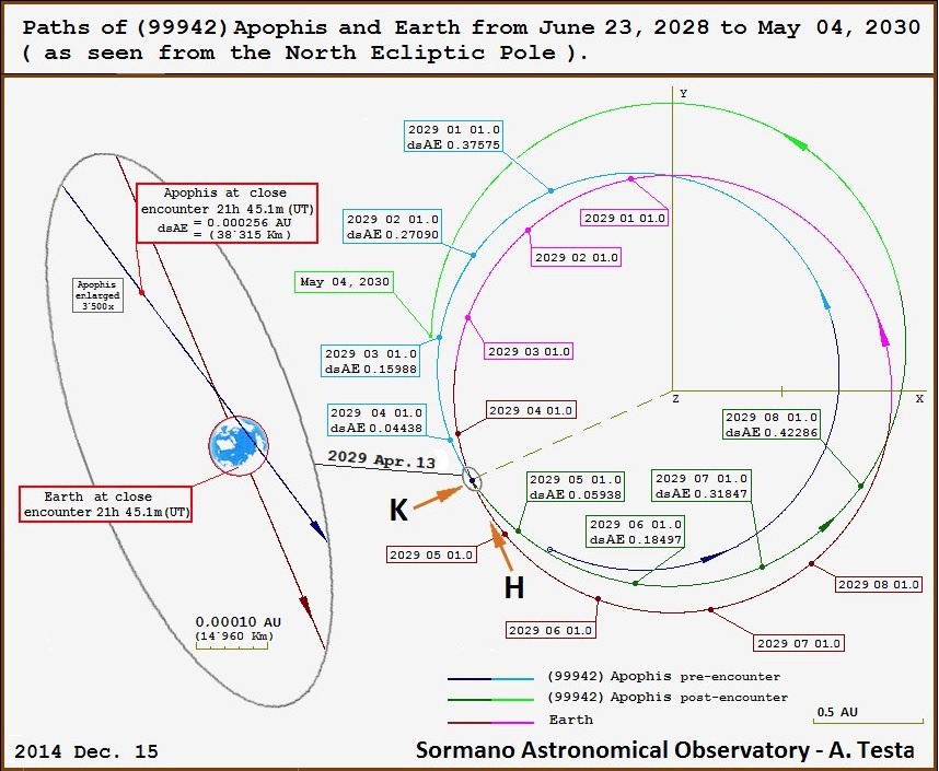 Nel grafico, preparato presso il nostro Osservatorio, le orbite della Terra e di Apophis durante la fase di avvicinamento incontro e successivo allontanamento nel 2029. (dsAE indica la distanza Asteroide-Terra espressa in U.A.)