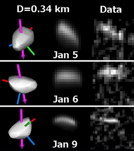 L'immagine raggruppa le migliori di Apophis, ottenute tramite il radiotelescopio di Goldston nel gennaio 2013.