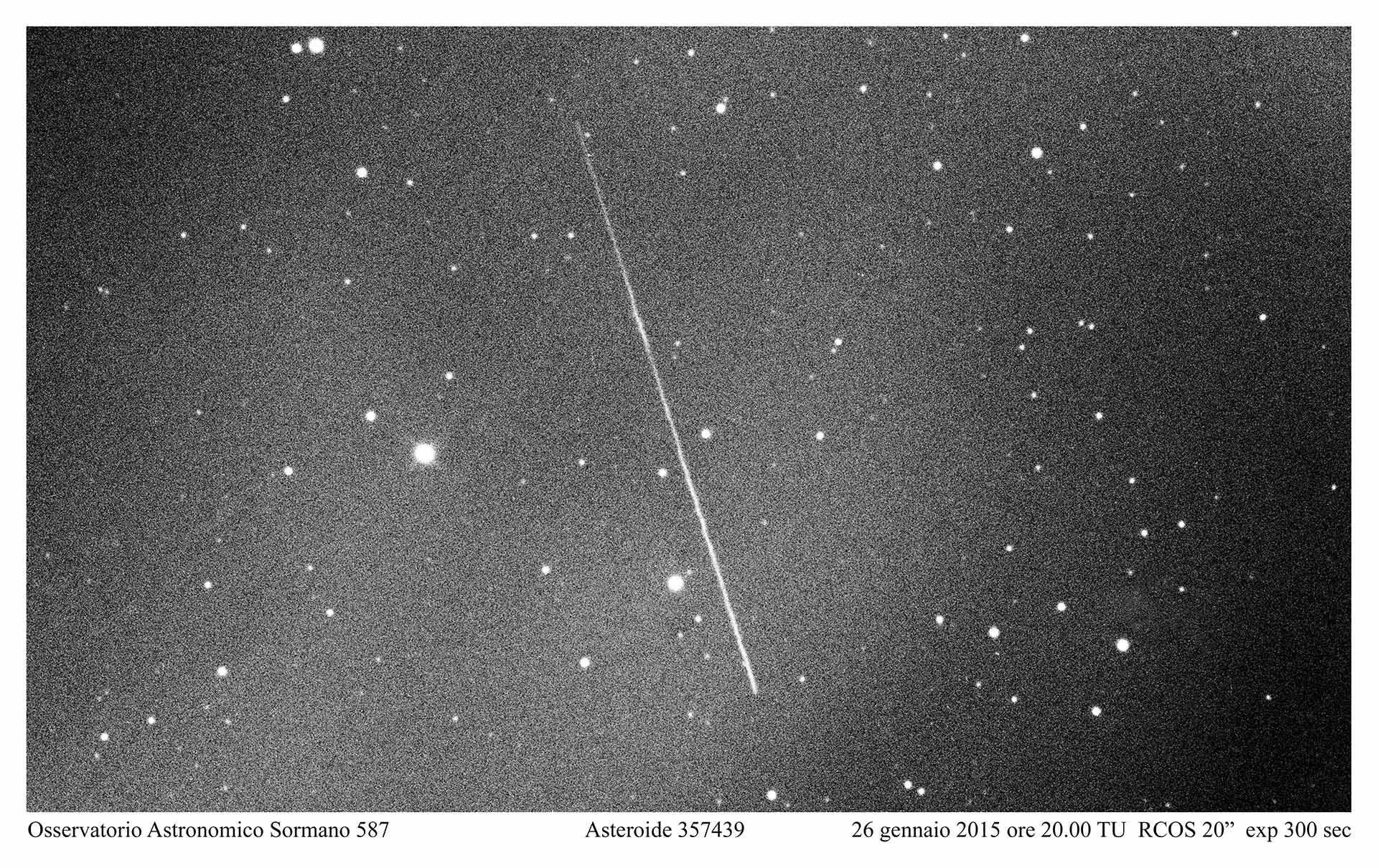 Nell'immagine purtroppo disturbata dalla continua presenza di nuvole, ripresa dall'Osservatorio di Sormano, la notte del 26 Gennaio è possibile vedere la traccia del passaggio dell'asteroide di magnitudine stimata in 9.6 V e con un moto apparente di circa 150 arcsec/min.