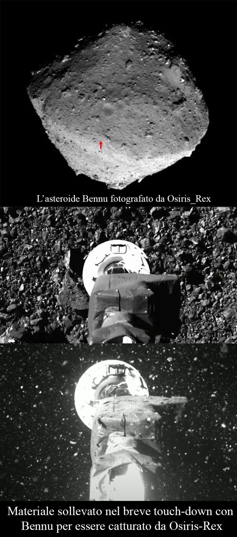 Osiris-Rex, prima missione NASA di questo tipo, ha fatto alcune interessanti scoperte sull’asteroide Bennu. Una delle più curiose e inaspettate è stata quella di osservare flussi di particelle che sfuggono dall’asteroide andando a formare quelle che qualcuno ha chiamato “lune temporanee” in miniatura. Si tratta di piccolissimi frammenti che per motivi ancora ignoti, si staccano dalla superficie per essere poi “ri-catturati”, dal campo gravitazionale dell’asteroide stesso. Da un punto di vista orbitale, Bennu appartiene alla categoria dei PHAs (Potentially Hazardous Asteroids = Asteroidi Potenzialmente Pericolosi) anzi, possiamo affermare che insieme a 1950 DA e (99942) Apophis, è in cima alla lista di quelli considerati più a rischio. La sua orbita infatti incrocia da vicino quella della Terra e col suo diametro di circa mezzo chilometro, in caso impatto, provocherebbe danni piuttosto ingenti. Possiamo però dormire sonni tranquilli. I calcoli eseguiti presso il nostro Osservatorio infatti non prevedono avvicinamenti troppo stretti, almeno per i prossimi duecento anni e uno studio condotto presso l’Università di Pisa ha stimato che le possibilità di impatto, in questo lasso di tempo, sono pari a 1 su oltre 15000. Detto ciò non sarebbe però male iniziare ad ipotizzare un programma che preveda di mettere in sicurezza il nostro pianeta da questo genere di rischi. Fortunatamente i primi passi in questa direzione si stanno già facendo e missioni come quella di Osiris-Rex e Hayabusa 2 possono certamente dare il loro contributo nel mettere a punto strategie comuni.