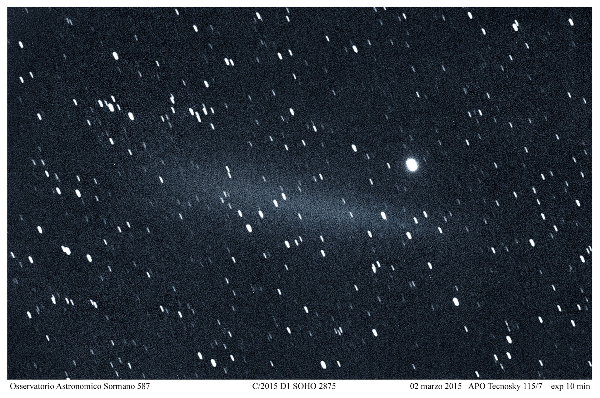 Il 19 febbraio scorso nelle immagini riprese dalla sonda SOHO (Solar and Heliospheric Observatory) appare una nuova cometa mentre sfiora il Sole . Classificata come C/2015 D1 Soho , la cometa si “accende” fino alla magnitudine 4 uscendo poi il 21 febbraio dal campo inquadrato.