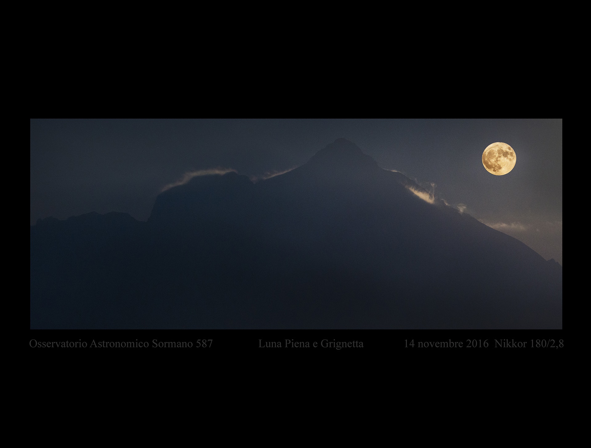 La foto a fianco è stata scattata dal “belvedere” della Colma di Sormano, in prossimità dell' Osservatorio, la sera della “superluna” con un piccolo teleobiettivo. Si era appena aperto uno squarcio tra le nuvole con gli ultimi vapori in dissoluzione sulla Grignetta e la Luna assumeva una forte dominante calda a causa della pesante umidità nell’aria.
