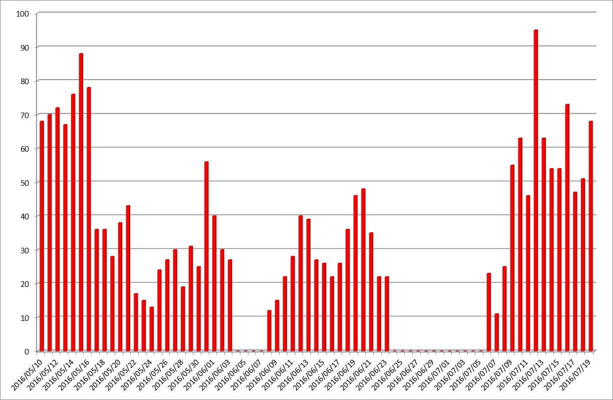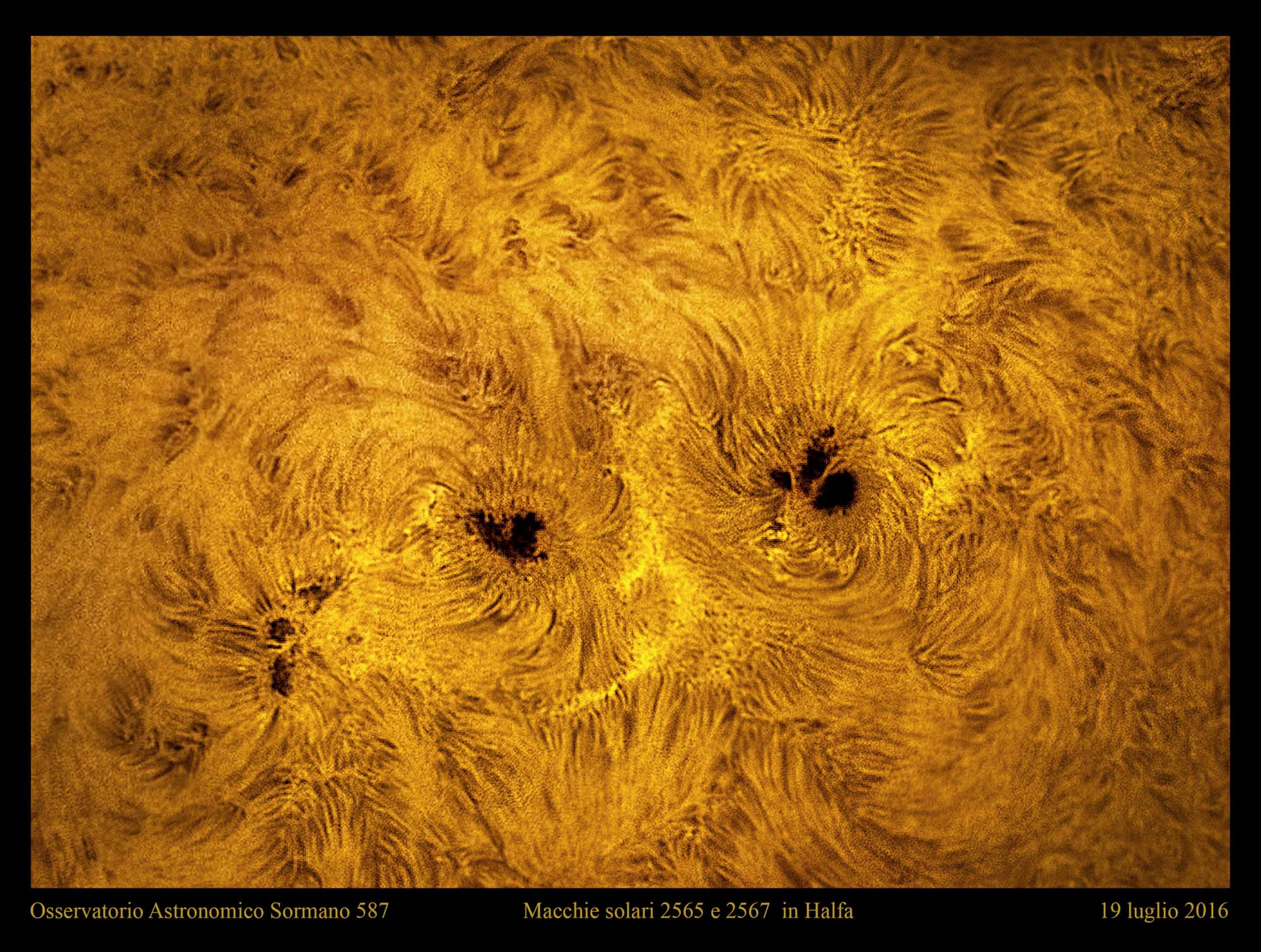 Nell’ultima decina di giorni si è registrata una leggera ripresa, con la comparsa di una macchia discretamente grossa chiamata AR 2565; essa è cresciuta rapidamente nei giorni successivi, fino ad essere affiancata da una gemella, la AR 2567, formatasi nel giro di 48 ore. Qui a fianco è visibile una ripresa fotografica delle due macchie in questione effettuata dal nostro osservatorio lo scorso 19 luglio mediante l’utilizzo di uno speciale filtro H-Alpha; è riportato anche un grafico che mostra l’andamento del numero di macchie solari negli ultimi due mesi. Pochi giorni dopo, il risveglio della nostra stella è stato completo: l’energia accumulata nella macchia 2567 ha dato origine ad una serie di enormi esplosioni (chiamate brillamenti o flare) avvenute sulla superficie del Sole; l’apice è stato raggiunto il giorno 23, con due flare di classe M5 (evento che non si registrava dallo scorso aprile) che hanno fatto da preludio ad uno di classe M7, il più violento di tutto 2016.