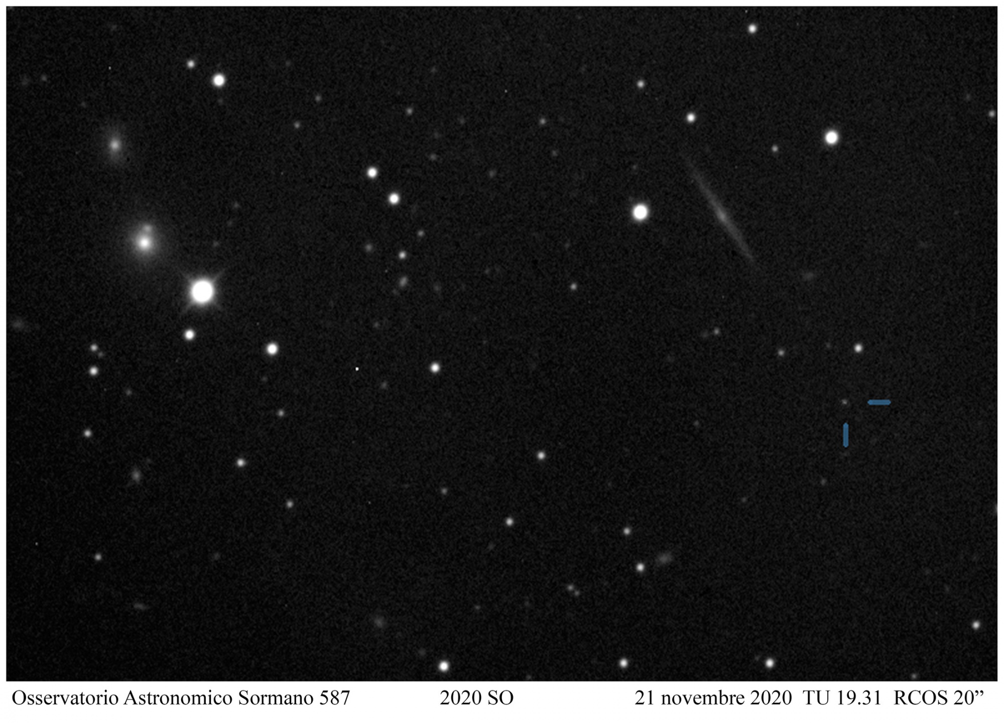 Foto 1: in questa immagine scattata la notte del 21 novembre i due trattini ci indicano 2020 SO. Al momento dello scatto, apparentemente vicino alla galassia PGC 9904 nella costellazione della Balena, brillava di magnitudine 18,8 ad una distanza dalla Terra di 880.000 mila km.